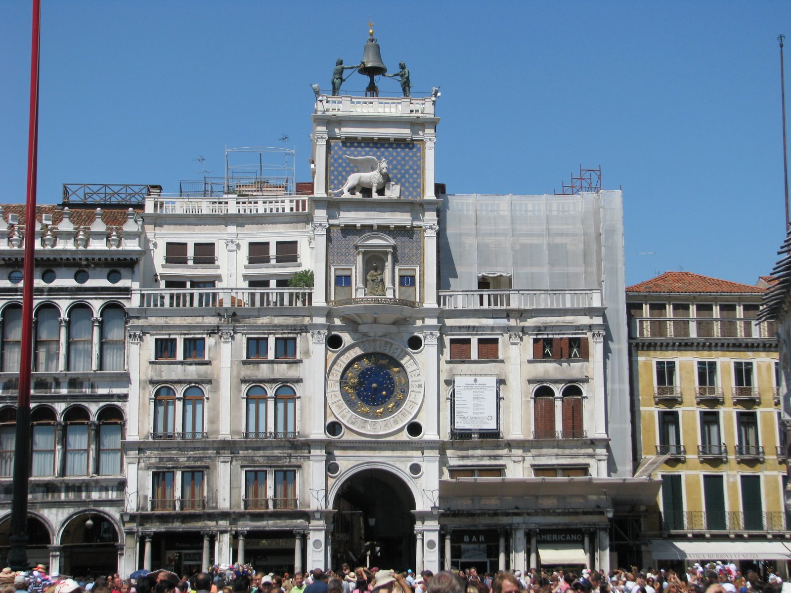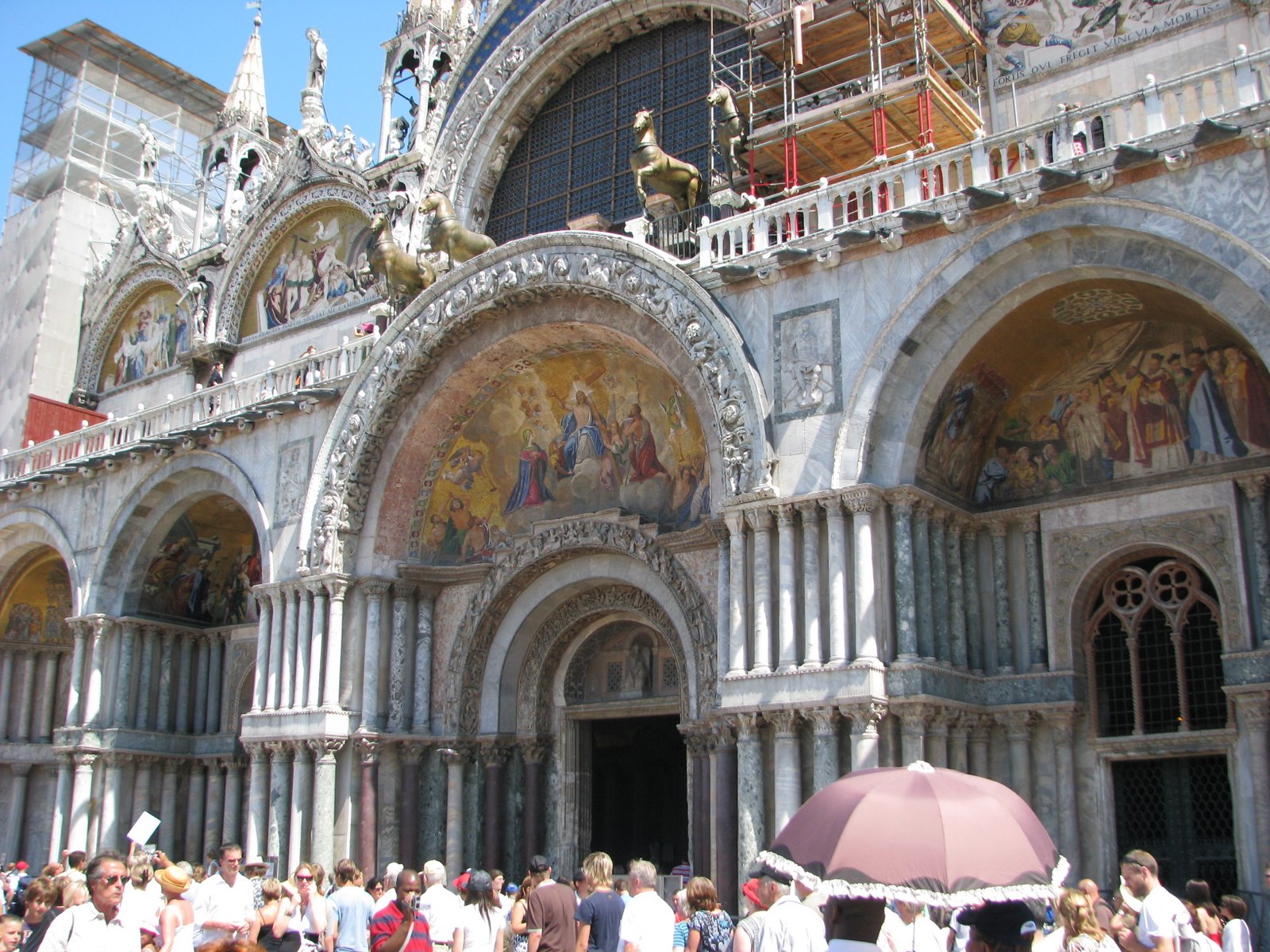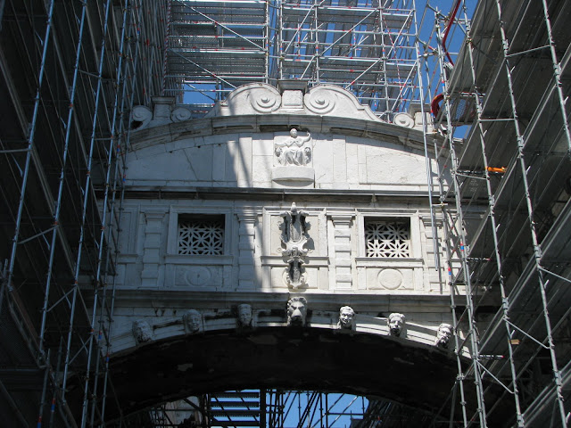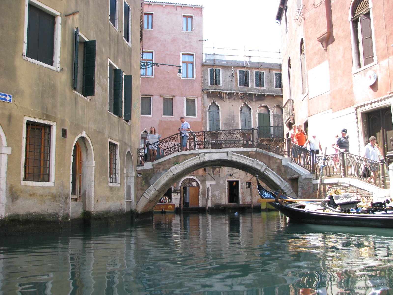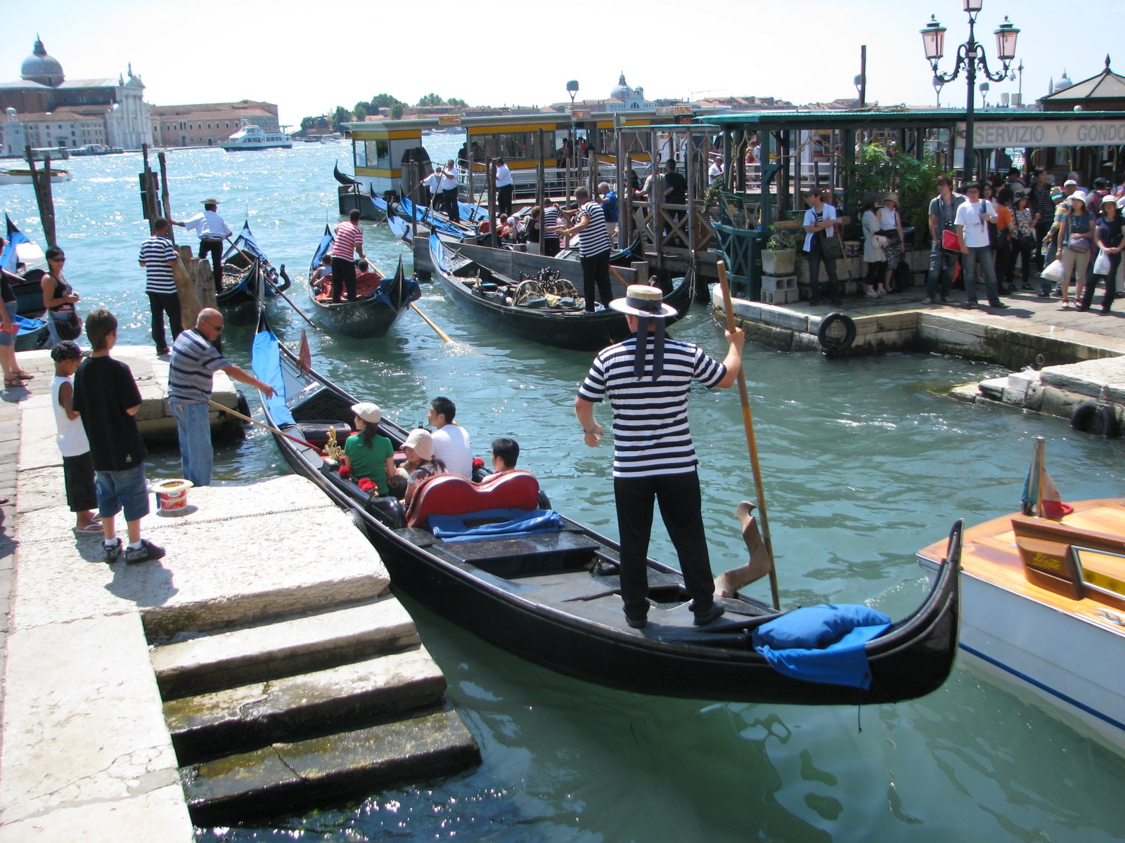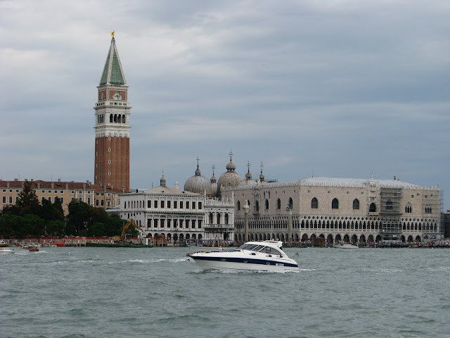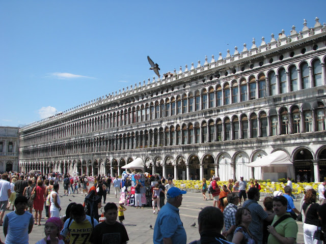 Первым делом мы прогулялись по площади Сан Марко среди дикого множества туристов. Она впечатлила нас своим размахом и восхитительной архитектурой окружавших ее зданий. Дворец Дожей – это просто завораживающий шедевр. Очень понравилось музыкальное сопровождение, исполняемое вживую музыкантами одного из кафе на площади. Впечатлило огромное количество толстых тушек практически ручных голубей, которых туристы кормят буквально с рук. Очень хотелось попасть в собор св. Марка, но огромная очередь на диком солнцепеке отбила это желание. После этого мы вновь вышли на набережную, где наглые и уверенные гондольеры (не побоюсь этого слова) начали предлагать нам совершить экскурс по каналам города «всего» за 200 евро. После некоторых торгов и отказов было принято решение сойтись на 100 евро и отправиться поскорее на просторы водной Венеции. Может это и дорого, может нас и «развели», но, во-первых, мы туристы и уж такова наша участь, а во-вторых, это действительно того стоило! Это был совершенно другой взгляд на город. Такого не увидишь, даже совершая пешую прогулку – совершенно другое виденье. В отличие от шумных и многолюдных улочек, каналы встречают тишиной водной глади и песнями гондольеров. Они раскрывают истинную архитектурную ценность Венеции – взгляд на город на воде. Точно, это было не зря.
